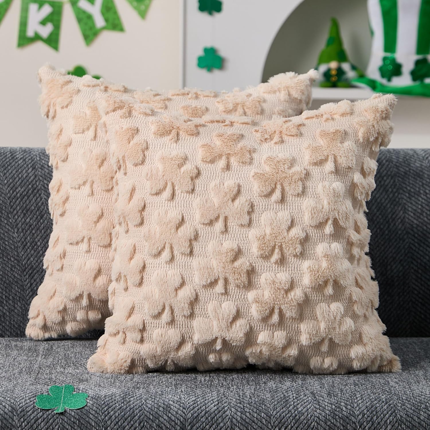 I bought these specifically to replace my plain beige pillows for St. Patricks Day without committing to a full decor overhaul. After three weeks of daily use in my busy living room (two kids, one dog, endless snacks), here's what actually happened.